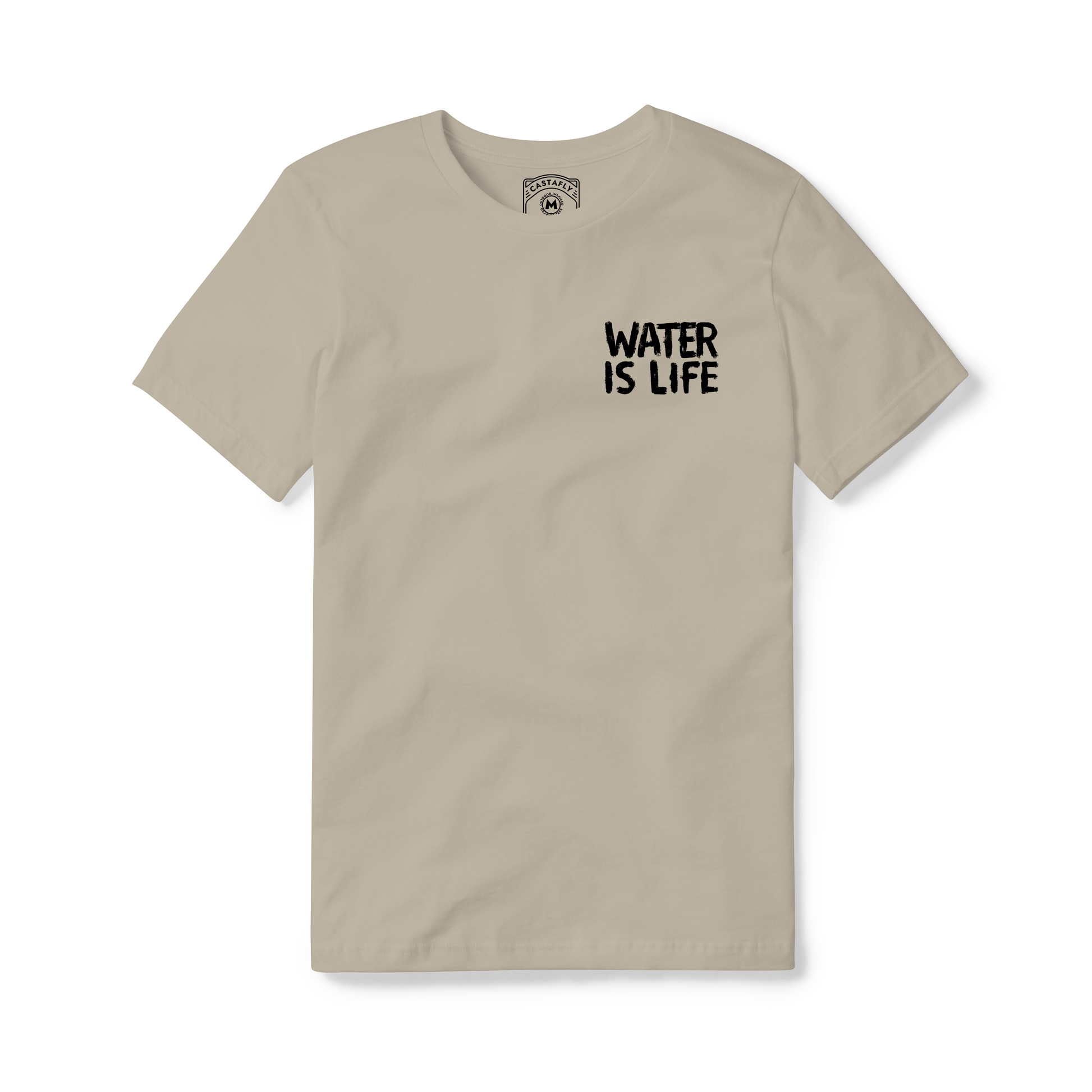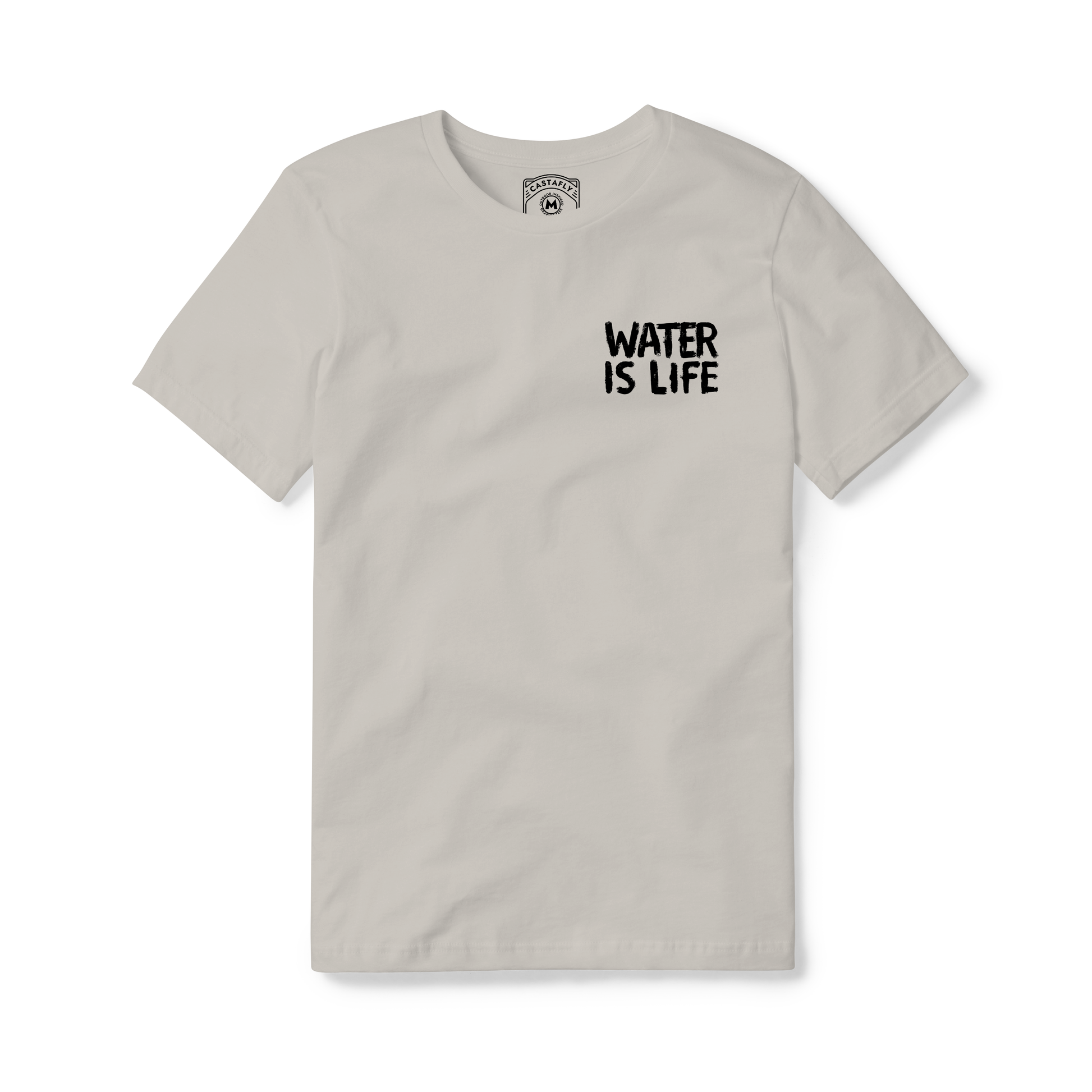 Water is Life. This tee showcases a water bottle filled with the great outdoors—a flowing stream, tall trees, and mountain peaks. A fresh reminder that every adventure starts with nature’s lifeline.
